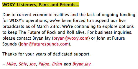 Pop Candy received some information directly from WOXY music director Matt Shiv who said the staff knew there were financial troubles, but maintained operations last week at SXSW because “a deal was ‘in motion’ to continue funding.” The staff only received notice of the closure from owner Future Sounds on Monday and were given no opportunity to say goodbye to listeners.
