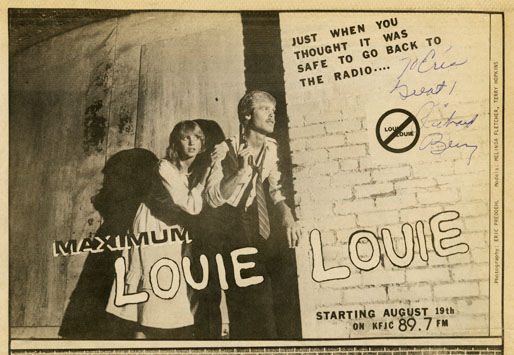 When KFJC announced it would produce a “Maximum LOUIE LOUIE” program that would push the limits of LOUIE-dom, the staff of KALX actually worked with KFJC to achieve that goal, sharing all of their exclusive LOUIE recordings, with KALX DJ Mel C. (aka “The Amazing Mystery DJ”) joining KFJC DJ’s for some on-air commentary about the event.