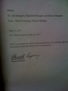 For those who are following Camping, Judgment Day will begin far away from Family Radio headquarters at about 11pm Pacific time on Friday, May 20, 2011. As it will already be 6pm on May 21st in New Zealand, this should mark the beginning of the Rapture. We’ll just have to see if there’s radio silence on May 22 or if Family Radio network continues with their broadcasts.