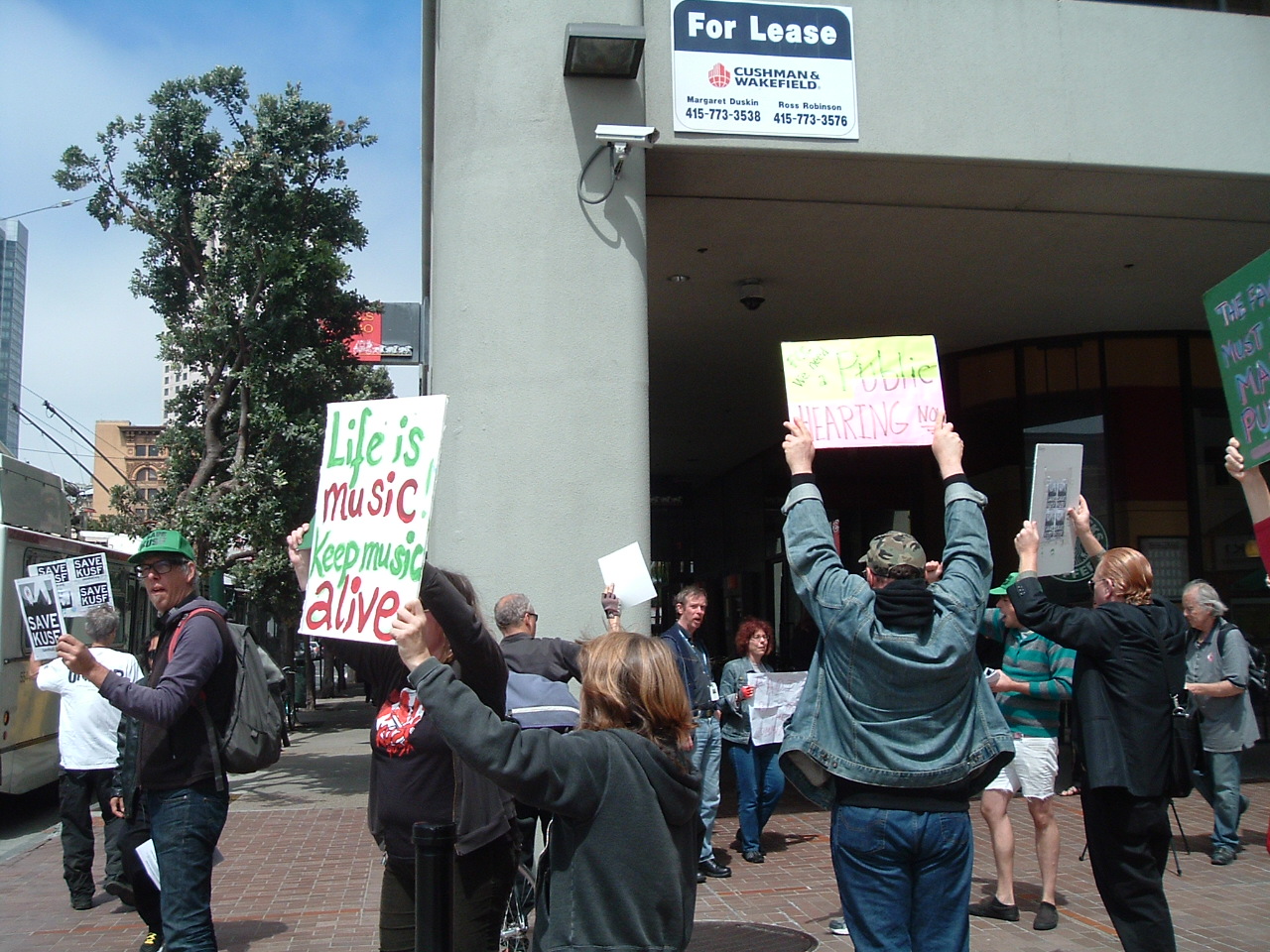 Ever since these signal changes, KDFC listeners have expressed displeasure because they are no longer able to hear KDFC south of San Francisco and KUSF listeners have protested because they have lost their station entirely. In part, yesterday’s protest was an attempt to raise awareness about Entercom’s role in the whole deal as many KDFC listeners might just think that all that changed was a place on the dial and a move from commercial to non-commercial. Representatives from Save KUSF handed out flyers that stated: