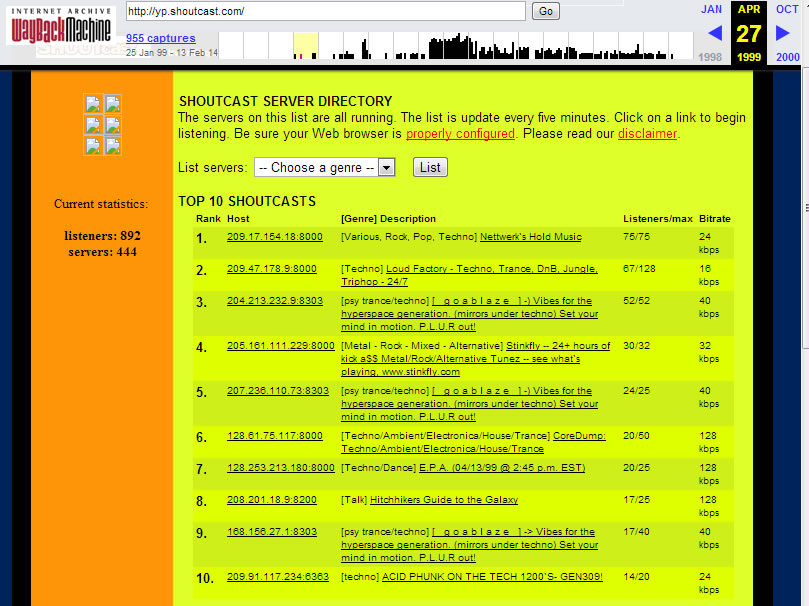 Just for kicks the other day I decided to go to the Internet Archive’s Wayback browser and check out Shoutcast as it was getting hot. This screenshot is from April 27, 1999 and displays the “top ten Shoutcasts,” which seem to have been overwhelmingly Techno music oriented channels (with pop and rock thrown in).