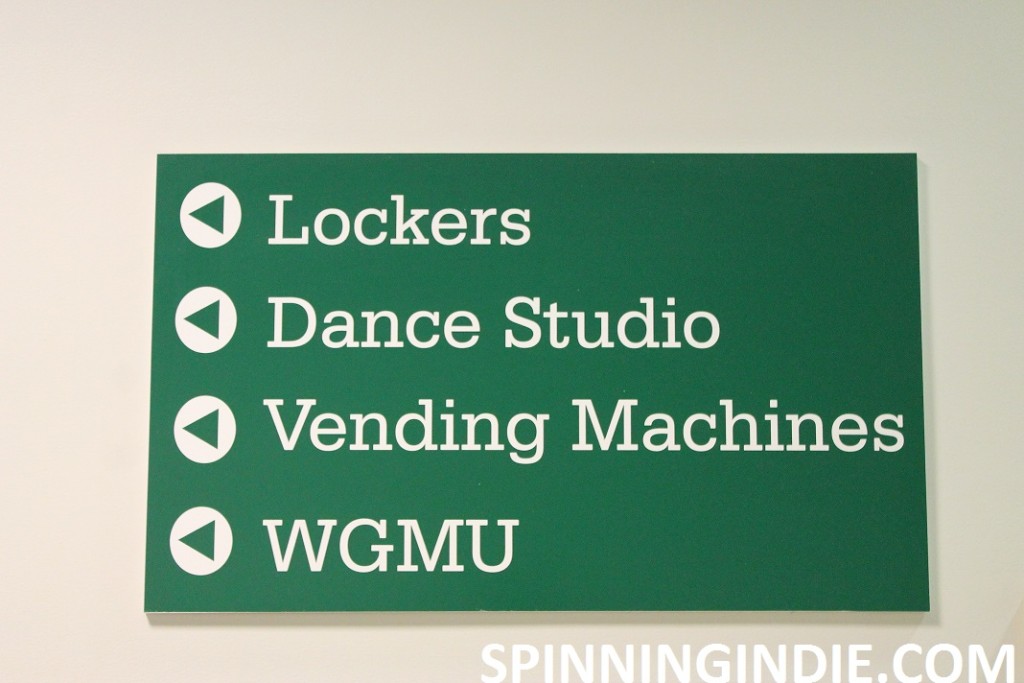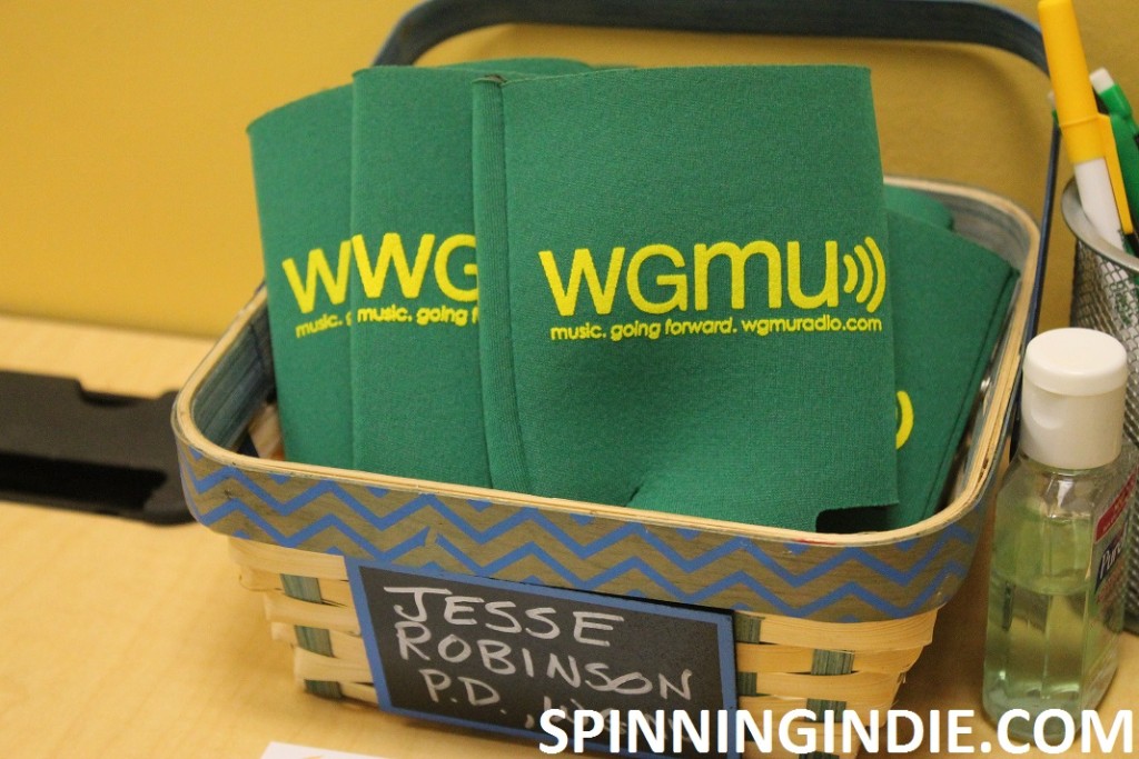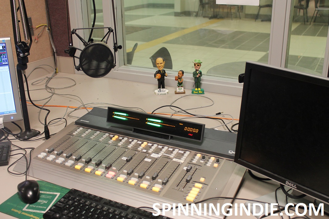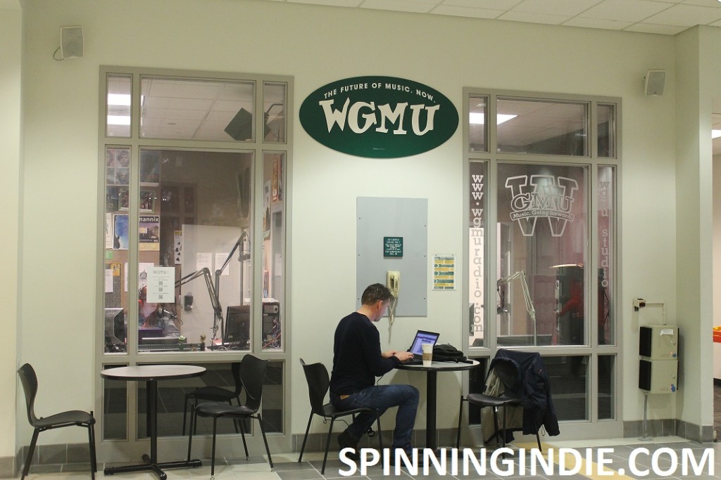 In addition to the live view that Johnson Center visitors have of the studio, web visitors can also tune in at any time to see the station’s live webstream. As I write this, the camera is pointed out towards the hallway, with a view of a collection of Bobble Heads visible on the station’s window sill. Speakers outside the station also play WGMU’s livestream, so people walking by or sitting at nearby tables can listen to the station.
