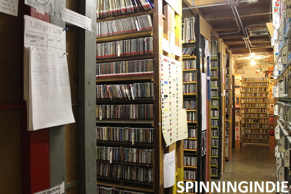 Beyond the KBOO lobby there are several offices, production studios (including the dog-free Studio 2), the on-air studio, a large room (Studio 1) that’s used as both a meeting room and a live music room, a spacious music library full of CDs and LPs, a listening alcove off of the record library, and rooms full of deeper storage that house shelves stacked with reel-to-reel recordings, cassettes, and more. DJs were in the studio doing live radio programs throughout my visit and KBOO prides itself on always having a live DJ or host in the studio and employs no automation system.