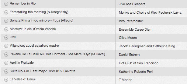 In pursuit of these sounds I went into the bowels of Earbits and put together a mix-and-match channel via Earbits’ many channel and subchannel options. Basically I created a custom channel called “Hybrid Highbrow.” Once you start up your channel, you get a huge choice of categories and subcategories. So to simplify things, I just chose the “Editor’s picks” option for classical, jazz, blues, and world. As a result, I got a great station that I’ve really enjoyed listening to over the holidays.
