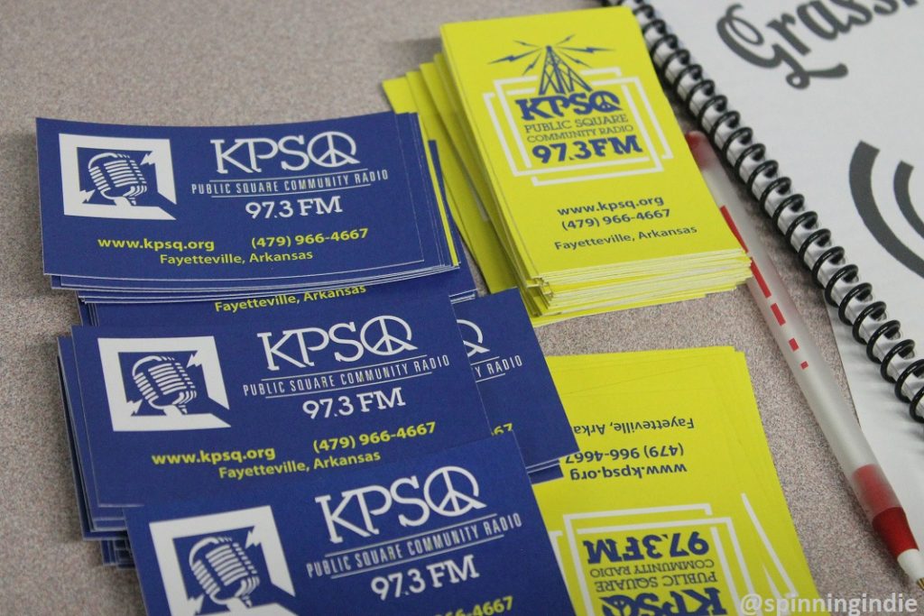 They had just wrapped up with participation in festivities during First Thursday Fayetteville, a monthly art event in the city’s downtown square. Sadly, I arrived too late for the downtown party, as I’d heard talk that Fayetteville has a thriving art scene, with someone describing the town as the “Austin of Arkansas.” Still in early days, KPSQ is very much in start-up mode, furiously spreading the word about the station and fundraising. At First Thursday, station members passed out leaflets to both promote KPSQ and alert passersby to an upcoming launch party.