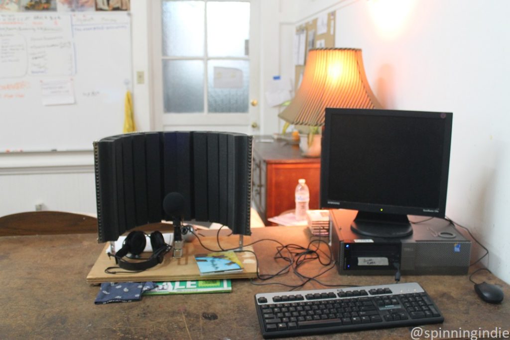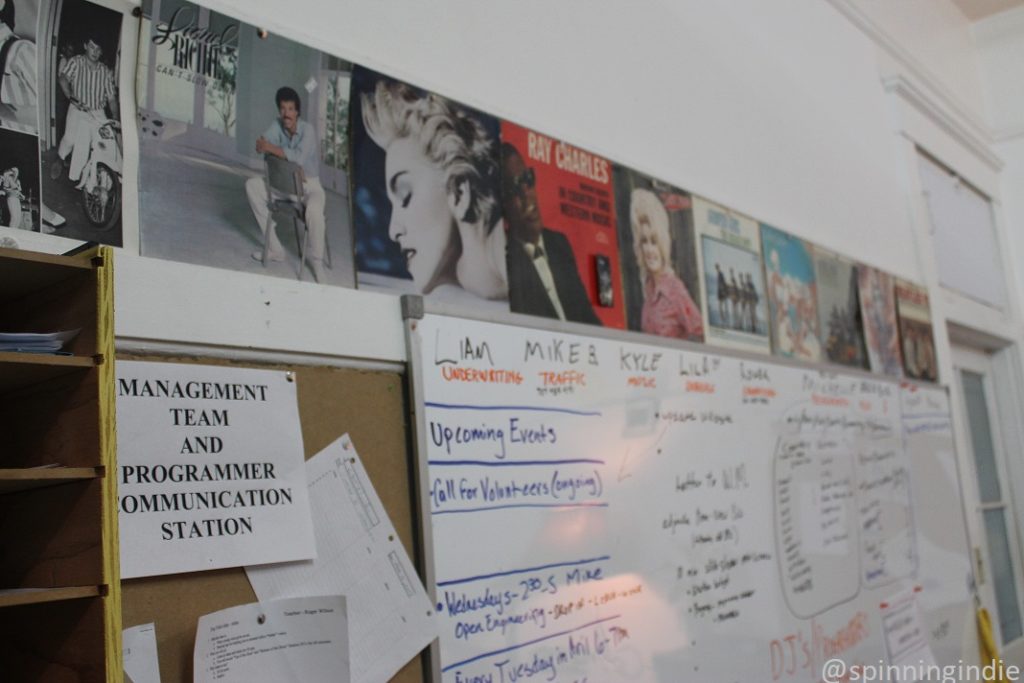 While KLLG has a small collection of vinyl records and CDs, most DJs bring in their own music to play, typically via CDs, vinyl records, cassettes, and digital files. During my visit, Chief Engineer Roger Wilson joked that the station has “one and a half turntables,” as he was working to fix a persistent hum emanating from one of them. The building’s vintage electrical system and 14-foot ceilings have presented various challenges for the station, yet much attention was put into the construction of KLLG’s free-standing, thick-walled studio within the former schoolhouse classroom space. Wilson, along with volunteers, did the majority of the work to build the studio and Cummins and others reminisced about crawling under the building in order to complete a few different tasks.