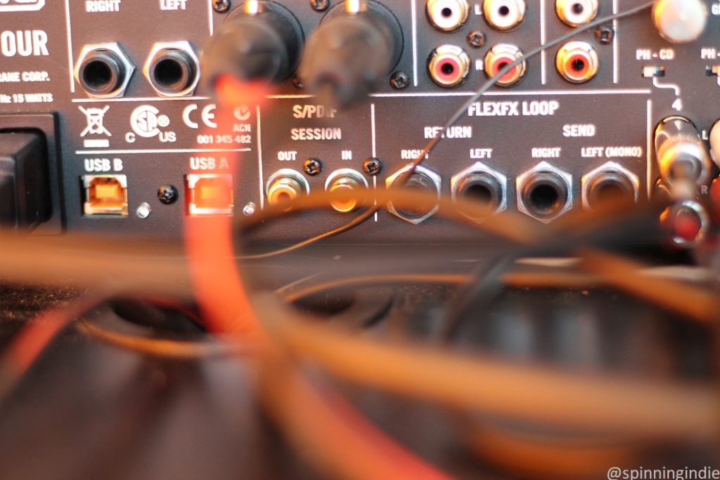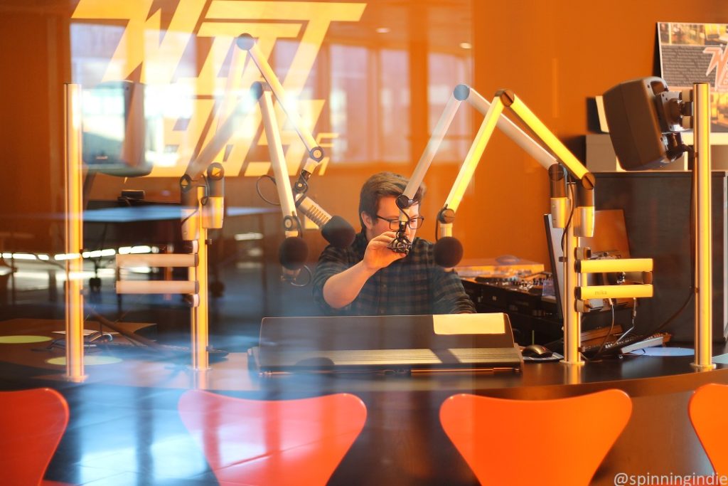A dramatic setting, the on-air studio basked in an amber glow during our lunch-time visit, with light streaming in from nearby windows covered in an orange honeycomb pattern. Spacious and triangular in shape, WIIT’s studio was arranged such that the on-air DJ is positioned with a panoramic view, including the angular terminus of the triangle. Different colored lights emanate from below the console table, programmed to interact with the music. As it’s a college radio station at a tech school, I wasn’t surprised to hear that the lights are controlled by an app.