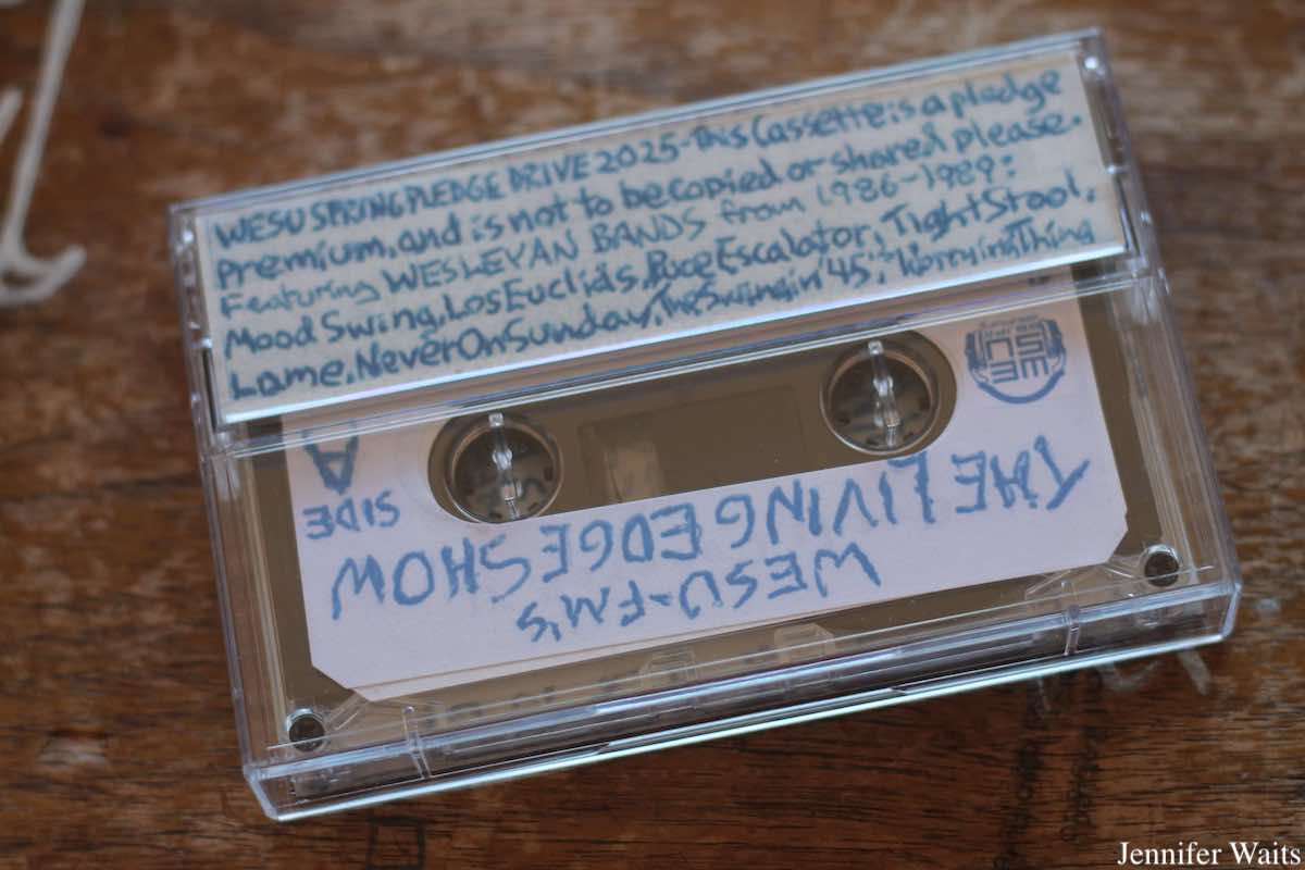 Having grown up in Middletown, Michael has a deep appreciation for the the history of WESU and its ongoing legacy. He regaled me with stories about archival audio finds and projects to bring the station’s history to life. After locating recordings from the 1980s show, “The Living Edge,” one of its co-producers crafted handmade cassettes earlier this year as a premium for WESU’s fundraiser. The cassette compilation includes cover songs performed by Wesleyan bands circa 1986 to 1989. Although a tape might seem like an unusual thing for a 2025 fundraiser gift, it makes sense for a college radio station that reveres physical music. WESU is one of the few stations that I’ve visited recently that had a collection of organized cassettes in its on-air studio.