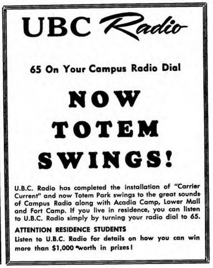 For the UBC Radio Society (Radsoc), programming continued over the campus loudspeaker network from the 1940s through at least the early 1980s, although additional methods were also employed throughout this period, with some shows airing over local Vancouver stations.