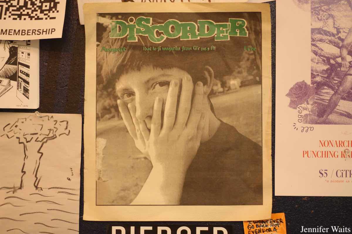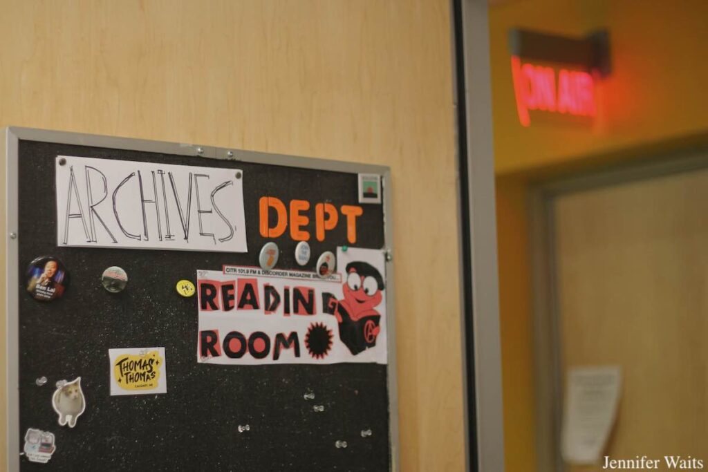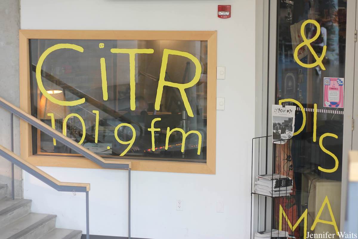 Today, CiTR (the station prefers to use a lowercase “i”) operates both a radio station and the magazine Discorder out of its home on the UBC campus in Vancouver, British Columbia, Canada. When entering the light-filled, mall-like and lively student union building (known as the AMS Student Nest), the CiTR space is easy to spot from the central atrium. The call letters and frequency (101.9 FM) are inscribed in such large type that they fill the studio window and an illuminated “on air” light hangs from the wall above. Additionally, a black CiTR Discorder logo adorns a concrete pole in front of the station. Located down a flight of stairs from the atrium, CiTR welcomes visitors during tours every weekday. Passersby can also pop by to grab a free copy of the station’s longtime (since 1983!) arts and culture magazine Discorder.