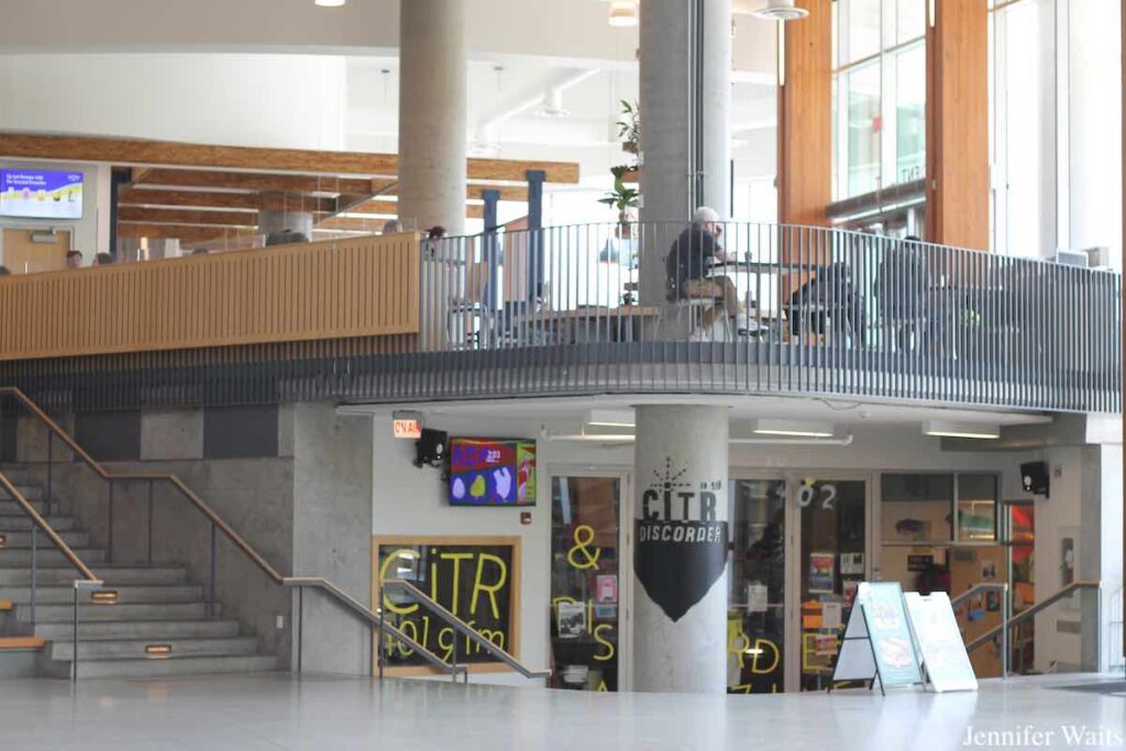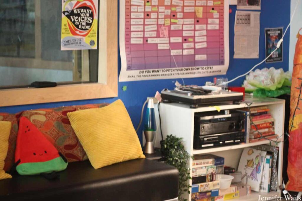 Another interesting feature of the CiTR space is its set of accordion-style windows that can be opened completely. The front windows abut the station’s lounge, which is full of seating, making it a regular student hangout option. But what’s especially cool is that CiTR can share live music with bigger crowds by simply opening those windows when musicians drop in for performances in the lounge. This semester’s activities in the space include a merch swap, movie screening, and open house.