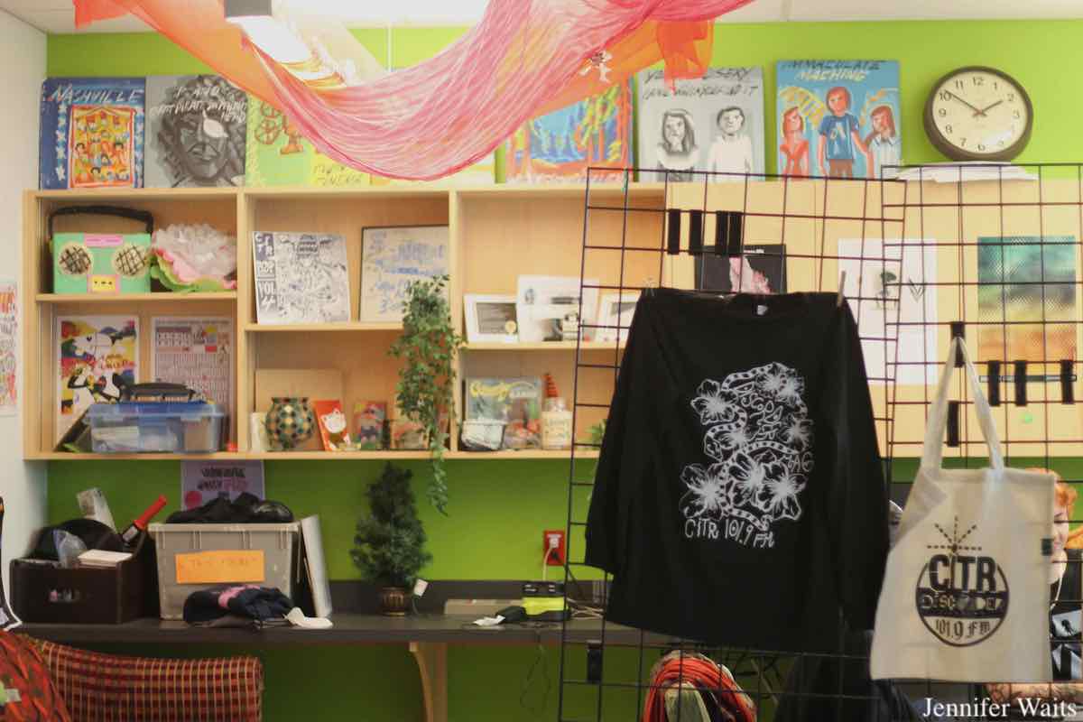 Underneath the paintings, the shelves are dotted with posters, CiTR compilation LPs, and even a paper boombox. A nearby display shows an array of eye-catching CiTR merchandise, including tote bags and t-shirts. The station also produces more unusual items, including bright blue beanies and translucent pink dice. Outside the station sits a rack containing copies of CiTR compilation records as well as issues of Discorder, all free for the taking.