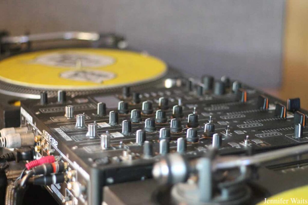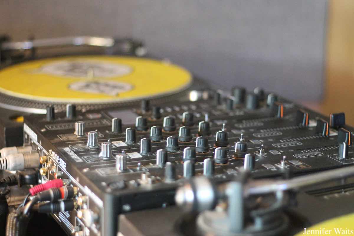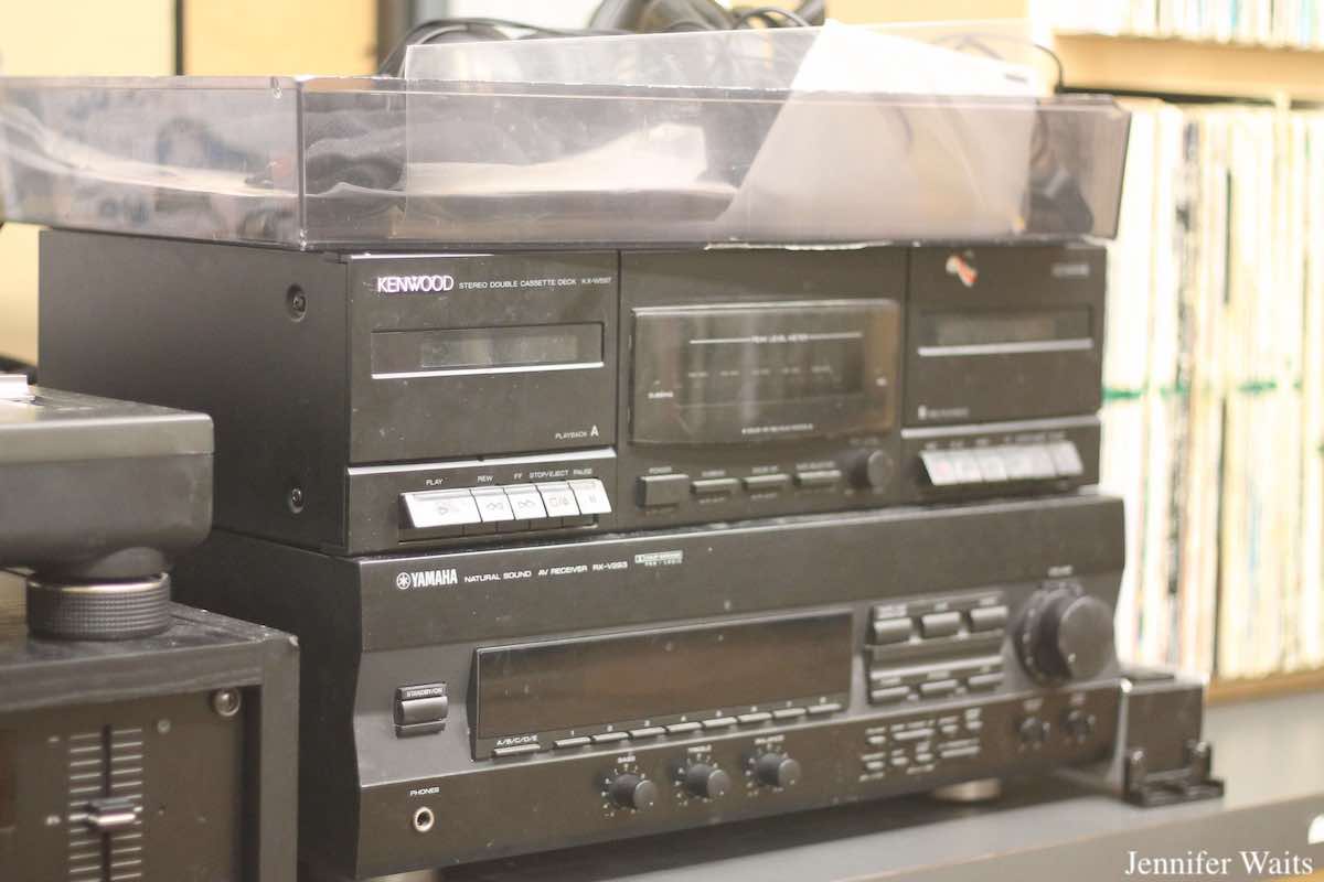 Like the sounds emanating from its radio signal, the bright and cheery space at CiTR is also full of personality. High up on a blue wall in the lounge is the CiTR/Discorder Donor Appreciation Wall, displaying cassette tapes and vinyl records labeled with the names of the most generous donors to the station. Across the room, a gallery of painter Steve Keene’s artwork featuring mainly artists local to the B.C. area sits atop shelves affixed to a lime green wall. I’ve spotted Keene’s wooden album-style paintings at numerous college radio stations, so it was nice to see such a large collection at CiTR.