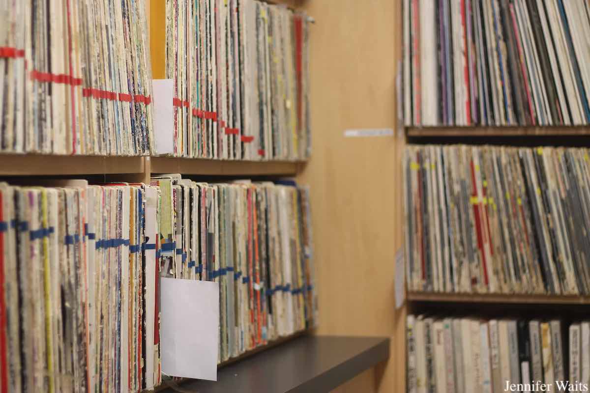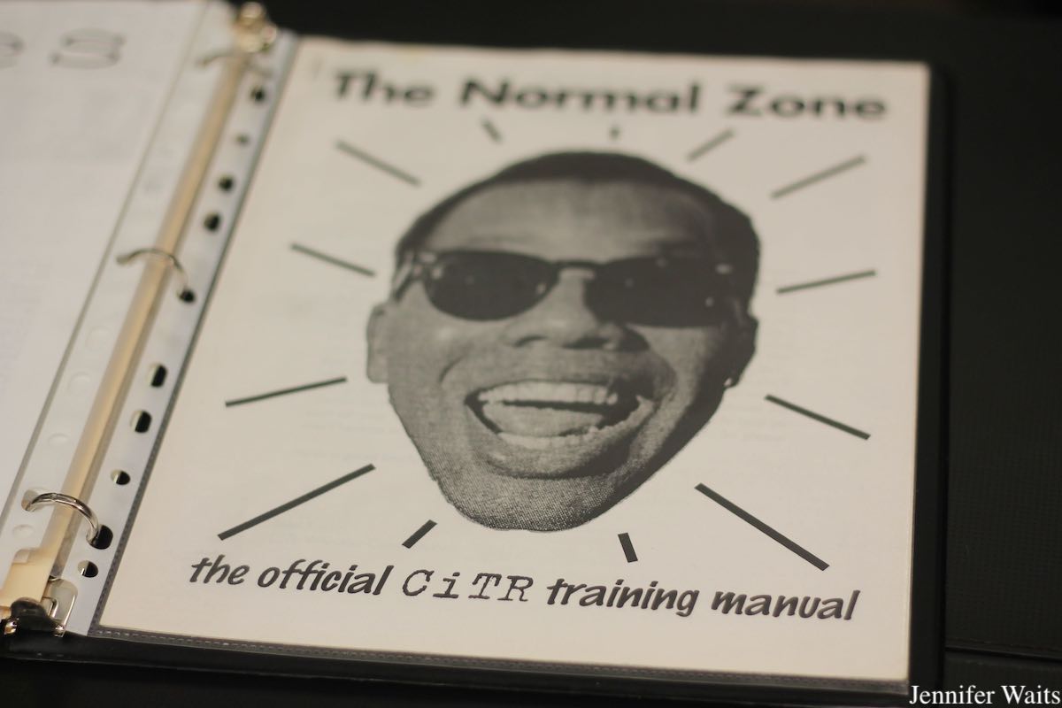 While I was heartened by the sight of a well-organized music library, I was equally thrilled to see CiTR’s dedicated archives room, which focuses on paper materials. Organized by a library science graduate student intern, JT Thomas, as part of a work-learn program, the space is set up like a reading room that one might find in a library’s special collections. After conducting an archival audit to assess materials located throughout CiTR, Thomas worked to develop systems and protocols for future volunteers utilizing the archives. At the time of my visit, the Archives Reading Room offered drop-in hours two afternoons a week for those interested in accessing the station’s physical collection. Within the room are copies of Discorder magazine, a 1990s CiTR hip-hop publication called Elements, 1990s-era CiTR training manuals and more.