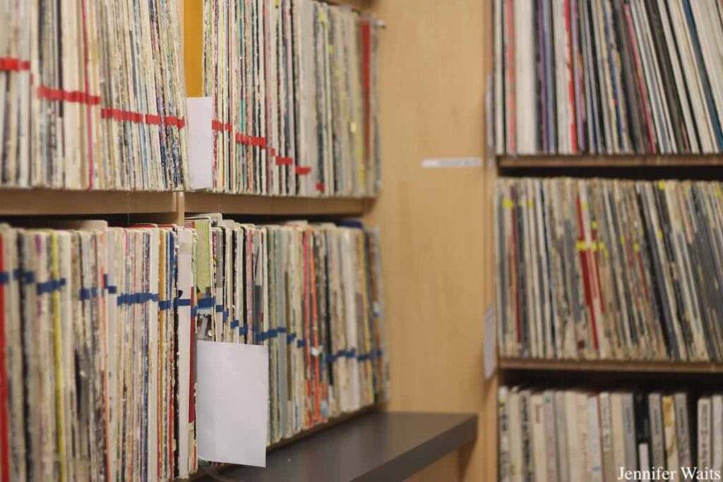 In addition to compilation LPs and Discorder, CiTR has also produced limited edition cassettes in recent years. A series of “Live from the Fishbowl Sessions” collections were released between 2015 and 2020 and feature recordings of artists that have played in the CiTR lounge. This dedication to physical media is also clear while walking through the station’s extensive music library. Yip estimated that the collection contains around 40,000 CDs, 11,000 LPs, 9,000 7-inch records, and 300 cassette tapes. Running out of space for the ever-growing library, CiTR now only accepts physical music from local artists, while focusing on digital music adds for everything else.
