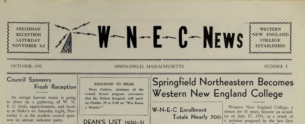 In 1969, a columnist for the Western New England College student newspaper, The Westerner, noted the irony of the college not having a radio station when the school was referred to by an acronym (WNEC) that resembled radio station call letters. This association was so apparent that a predecessor publication, the W-N-E-C News, incorporated an illustration of a radio tower in its flag when it launched the rebranded paper in 1951 following the school’s name change (it was previously part of Northeastern University). Nearly 20 years later, students did launch a campus radio station, calling it WNEK. And eventually, the school became a university and switched to a three-letter acronym (WNE), leading to far less confusion with radio stations on and off campus.
