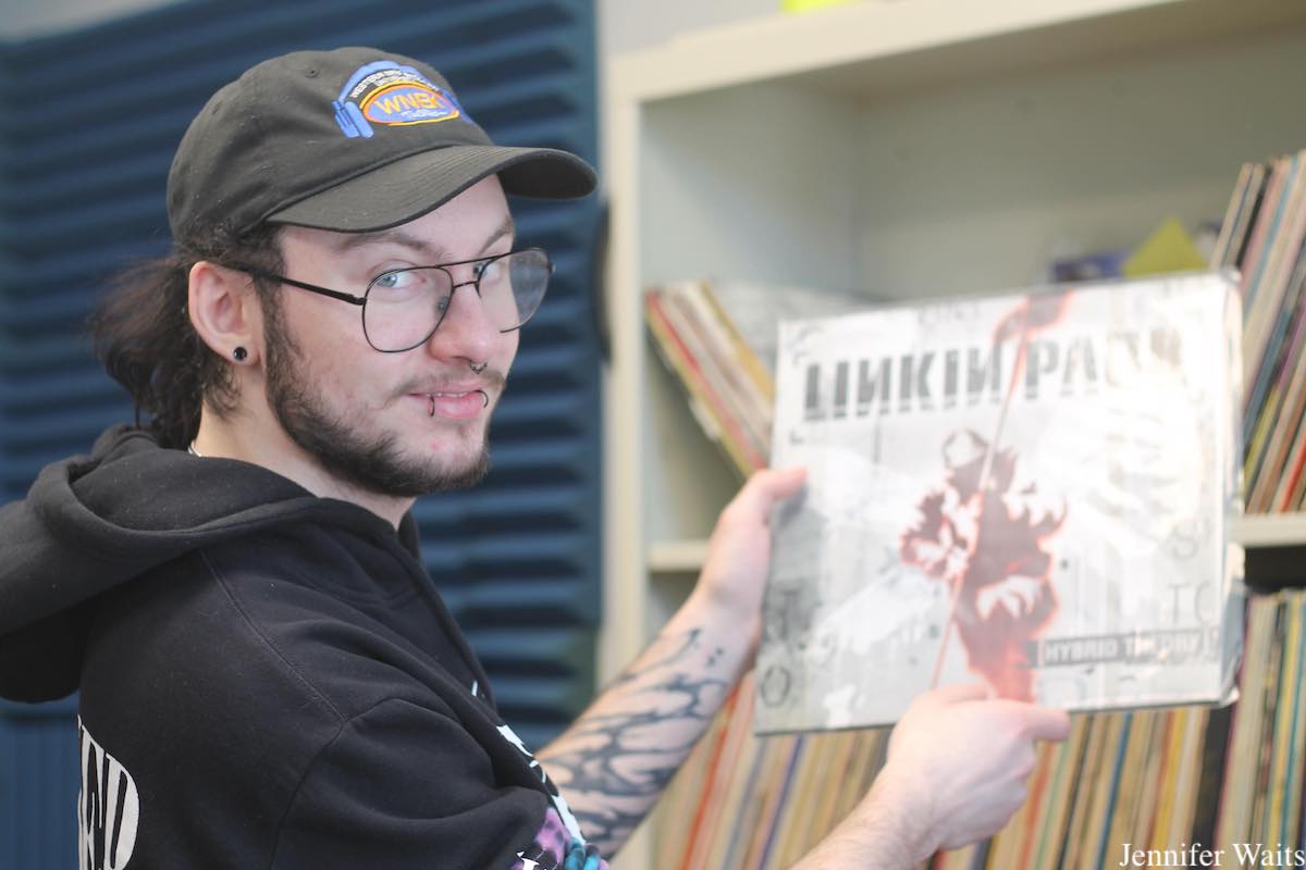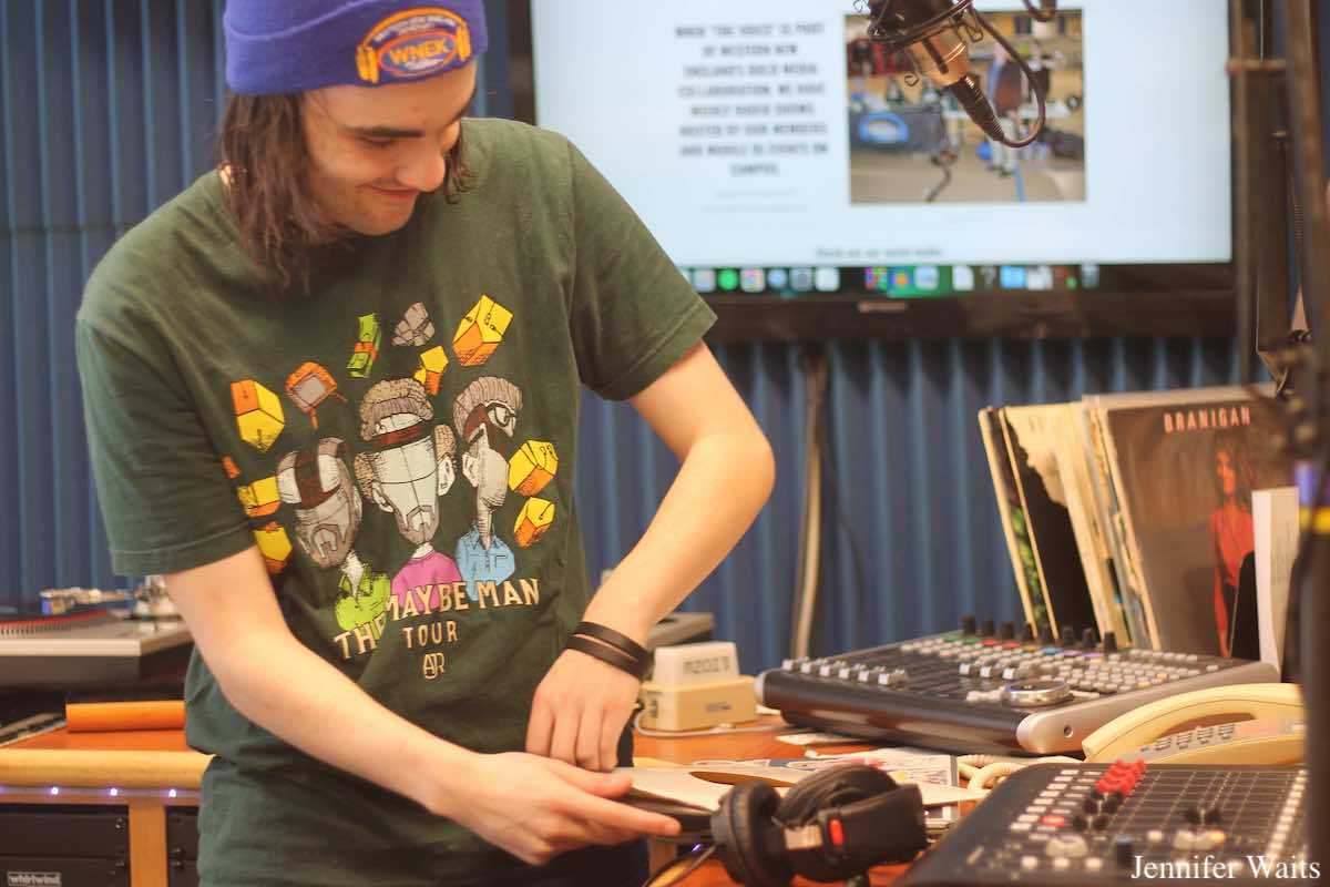 When I entered the studio in the St. Germain Campus Center, a record was spinning on the turntable during WNEK Director of Shows Jake Lavallee’s live program. “I’m a big physical media collector,” Lavallee noted, as we chatted with members of the WNEK leadership team. Over the years he’s brought in his own records to play on the air and he also expressed his appreciation for the WNEK music library, noting that he and Head of PR Steven Bromberger are especially “fond of the vinyl,” at the station. Luckily, the on-air studio shelves are full of LPs from the past, which the crew of WNEK members happily pulled from in order to share some of their favorite albums with me.