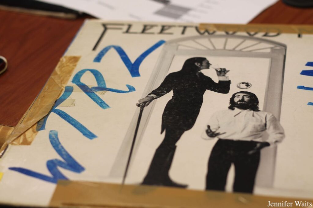 Only about half of the music library is housed in the studio, with the WNEK CD collection stashed away in a dark upstairs closet. By the glow of cell phone flashlights, we did a quick archeological dig through the space and spotted gems from decades past. Stored near the CDs are a smattering of carts (including one containing an Edwin Starr cover of “War”), as well as a metal cabinet covered with stickers.