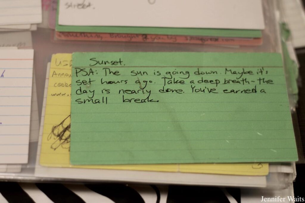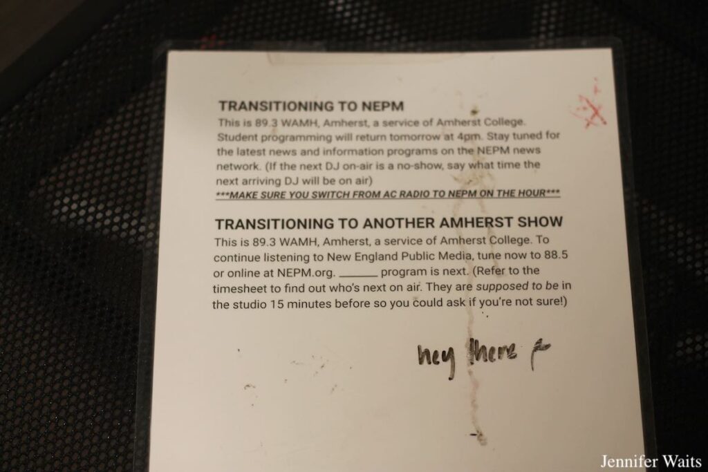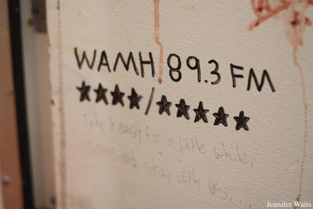 A quirky aspect of WAMH is its use of handwritten public service announcements (PSAs). Written on colorful index cards, the PSAs include expected topics like flu prevention tips from the CDC, but also include obtuse messages unrelated to a particular agency or non-profit. One example, the purple-inked “Not that Deep,” says, “it might not seem like it in the moment, but it will pass. take a deep breath. control what you can control. in the end, will it really matter tomorrow? next year? in a decade? it’s not that deep bro. let it go.” Stacks of these DIY PSAs sit in plastic sleeves in the WAMH studio, waiting to be read on the air.