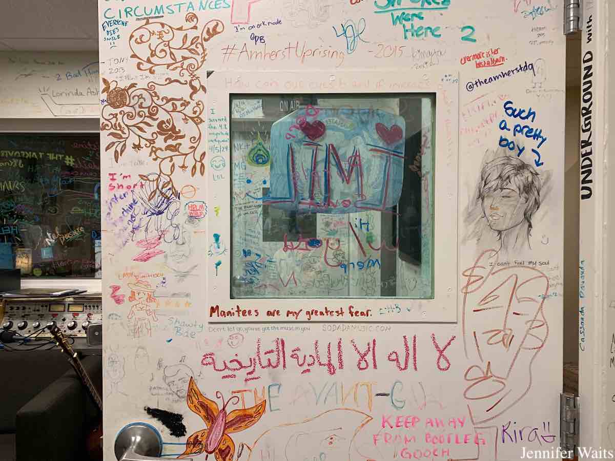 With the station move to a new student center imminent, members of WAMH are reflecting back on the station’s history (a few joined me for the visit to the college archives) and are working to preserve the materials in their current space. The station invested in a scanner in order to digitize various paper items. Documenting all the scribbles on the walls is a bit more challenging, but is equally important since it’s become a tradition to leave one’s mark on the station. “As soon as you become a DJ, you can write on the wall,” Liu explained, adding that even though the length of the notes varies, “it’s cool to watch how things have kind of grown and new things keep getting added.”