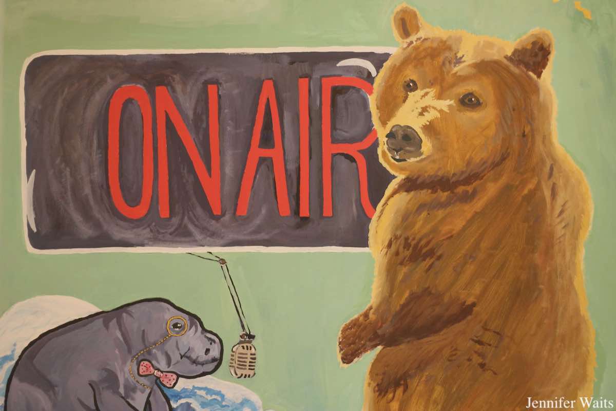 And indeed my trip to WAMH (pronounced “wham” conversationally among station members) did not disappoint. Its home on the 2nd floor of the Keefe Campus Center is full of personality. One wall of its entryway is decorated with a vibrantly painted mural featuring a bear, transmitter tower, vinyl records, and a manatee. A few years ago WAMH “adopted” two manatees, Howie and Nick, so the animal has become an unofficial mascot, even though there’s no obvious connection to Amherst College or the station (the school’s official mascot is the mammoth). Adjacent to the mural, a narrow hallway contains shelves of CDs as well as other miscellaneous items, including boxes of WAMH materials, file cabinets, and audio equipment.