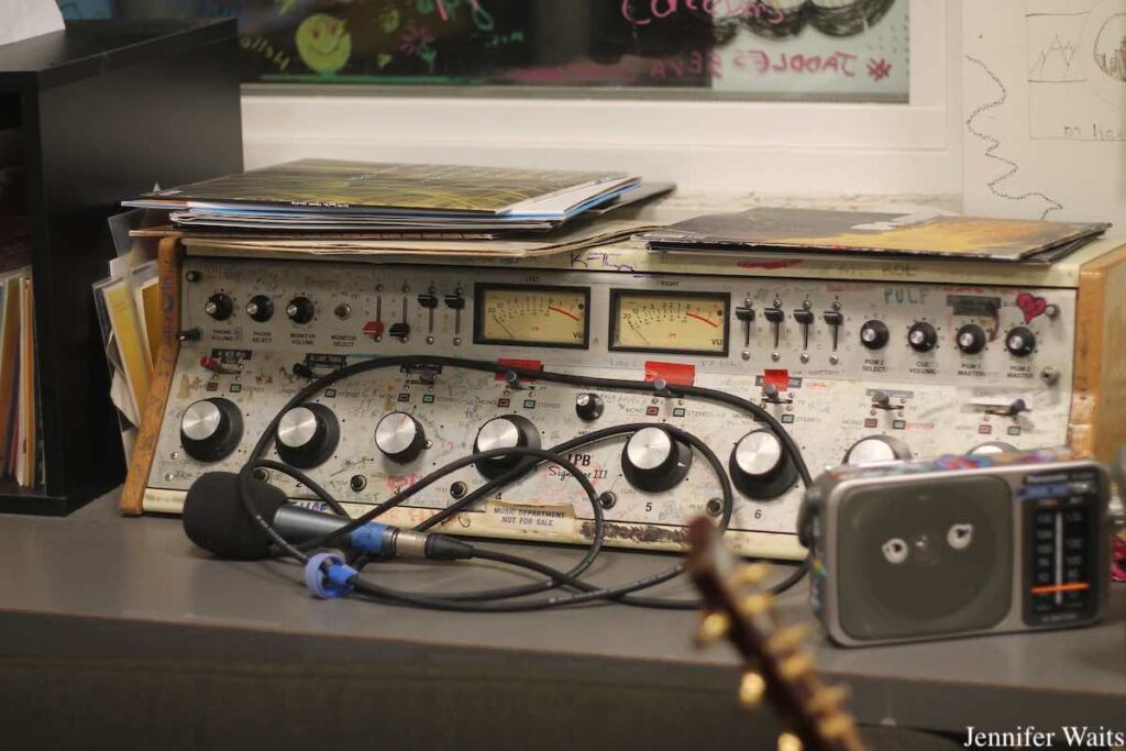 From there, a door leads to the main station space, whose white walls are covered with colorful drawings, notes, and autographs from DJs and celebrities. A cluster of grey couches provide a seating area with views of the two adjacent studios. Signs of the past are everywhere, from a 20th century audio console, to a weathered Leonard Cohen LP, to a 1993 poster for a Swirlies show, to an even older poster for a Ramones concert presented by WAMH. A Leo Blais-crafted WAMH sign (it’s always a thrill to see one of these college radio staples) sits perched over audio equipment in the studio. Hidden away in an old production studio, now used for storage, are wooden cubbies, with one cube labeled “current CMJ New Music Report,” a reminder of the days when that radio industry publication was read cover to cover by stations.