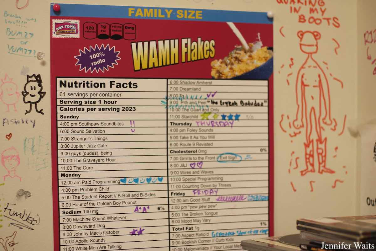 Liu was excited to show me some beautiful schedule posters for WAMH (including a few that she made), which have a different design every semester. One has a radio dial theme, another (“WAMH Flakes”) resembles the nutrition facts section on a cereal box, and the Fall 2024 schedule depicts the daily lineup in squares that look artwork within a CD case. In the archives I saw a large collection of similar posters from the past, so it was wonderful to see the tradition being maintained.
