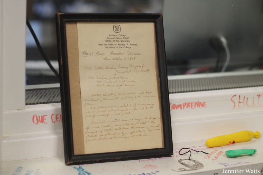 But perhaps the oldest item is a handwritten letter from 1948 detailing a front page story in the Amherst Student about the launch of the radio station. The letter describes “two studios, a control room, an engineer’s shop, an office and a meeting room” in the Walker Hall basement, with wires connecting the station (then called WAMF) to “various dormitories.” Having visiting the Amherst College Archives and Special Collections that morning, I had a bit of a preview of the rich history of WAMF-WAMH.