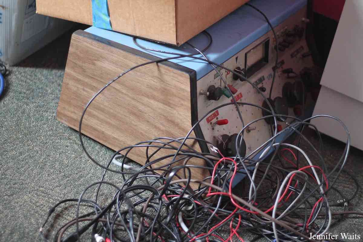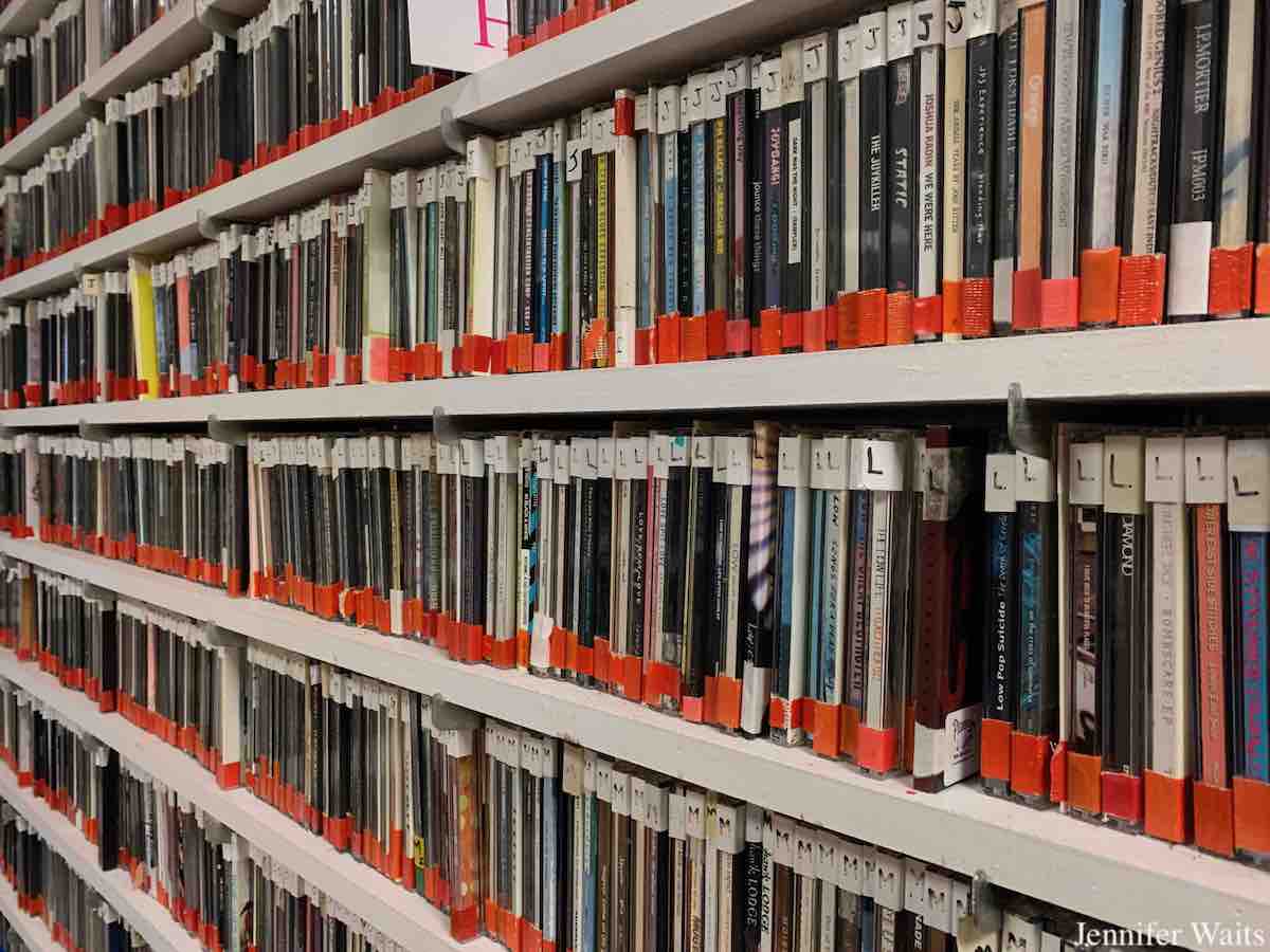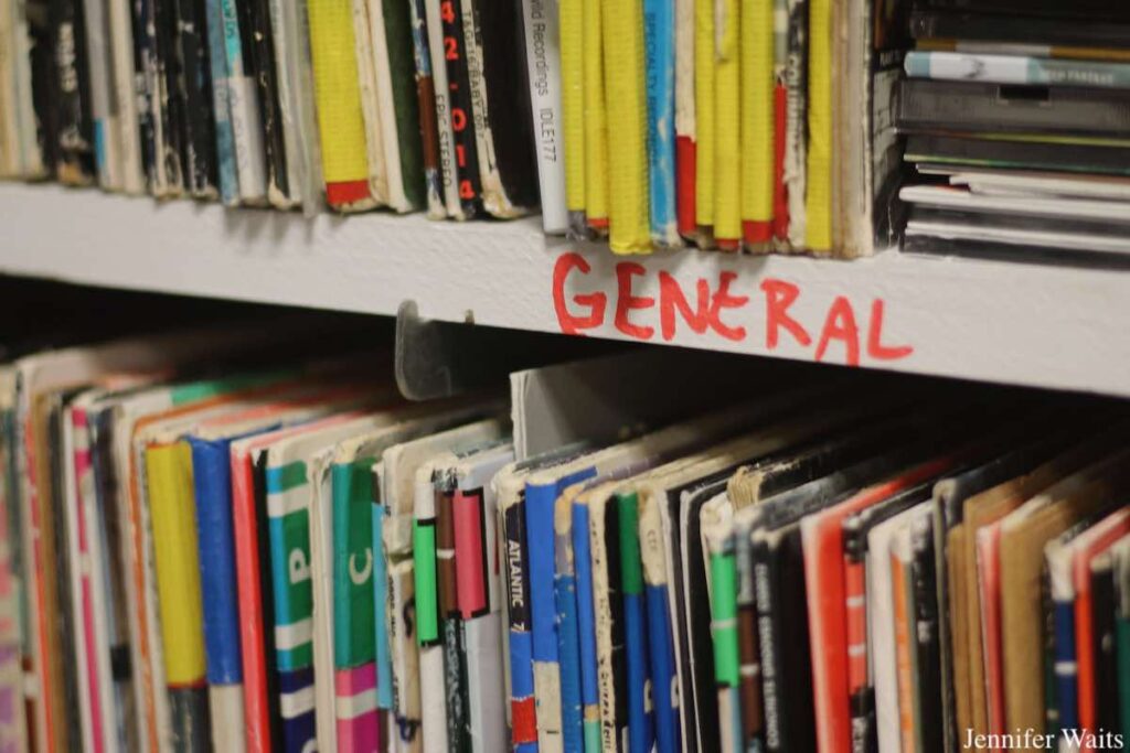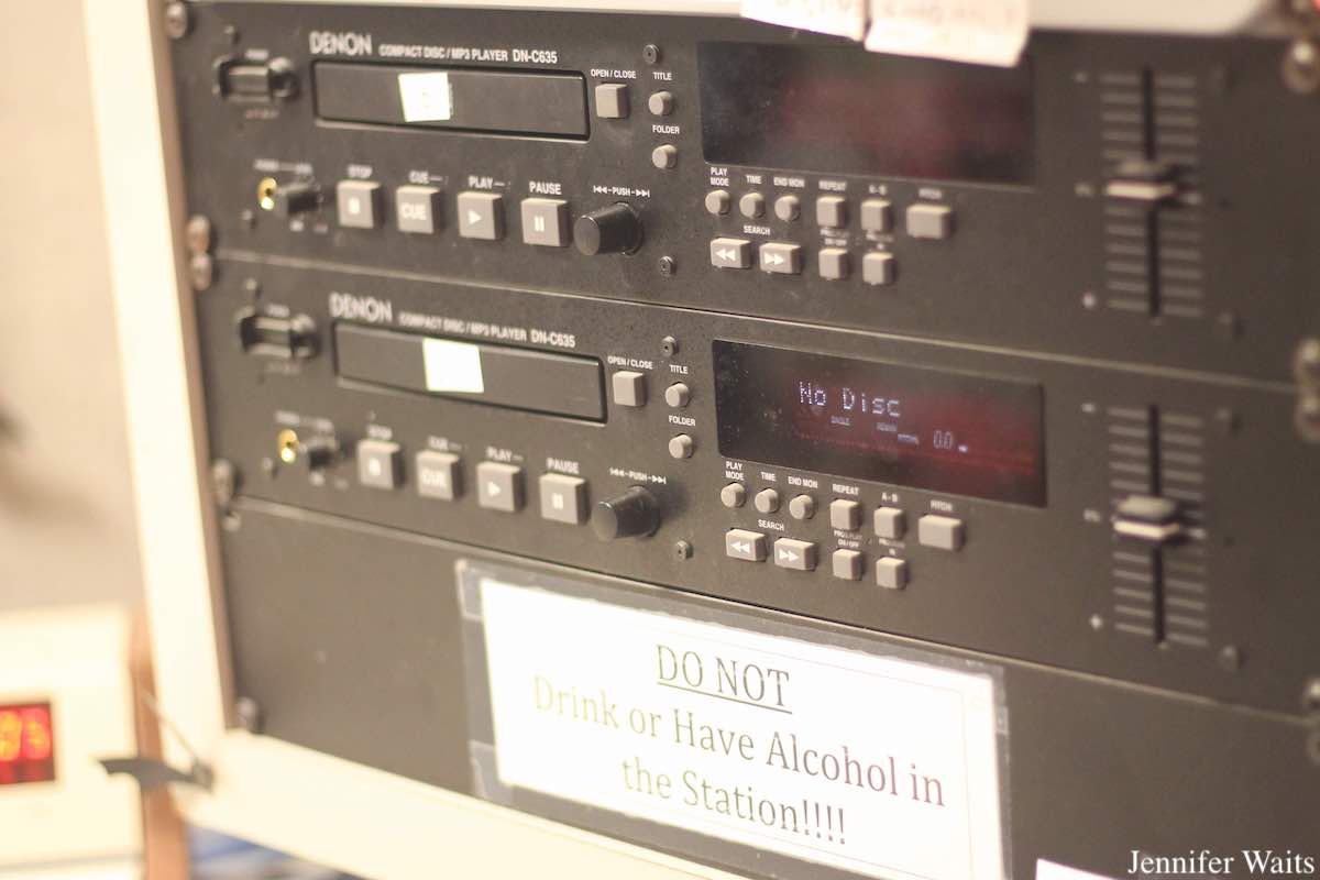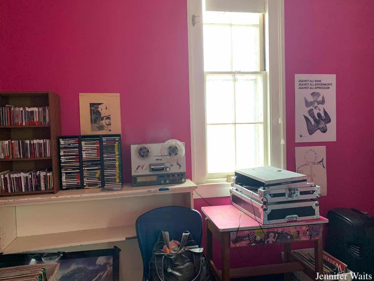 Up another flight of stairs, in the clubhouse attic, sits the station’s transmitter room. Rarely visited by current WOZQers, clues in the space indicate that in the past it was also used as a record library and office. With pink and purple walls, the main room is largely empty except for the transmitter, a table and a few chairs. Past that room is a nook containing built-in shelves dotted with small strips of tape with faded, hand-written genres labels, indicating the old sections for Latin, Irish/Celtic, Punk/Hardcore/Loud Rock, Classic Rock, and 80’s records. There’s talk of reactivating these former WOZQ spaces, which were largely vacated after the station moved to the new campus center.