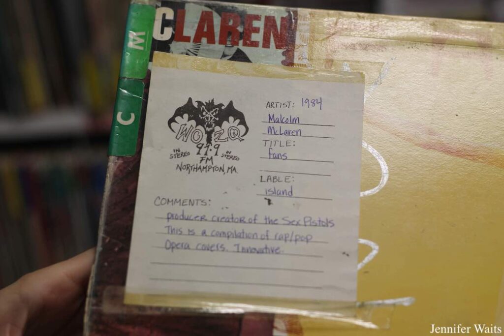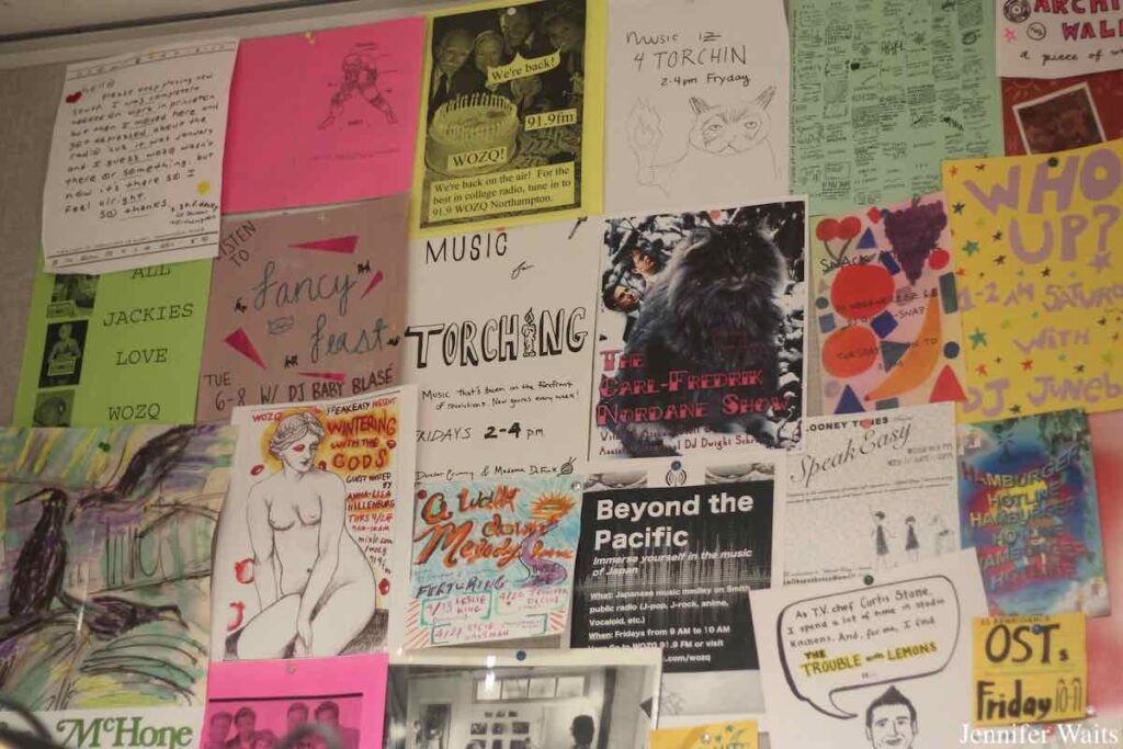 Located on the bottom floor of the Julia Child Campus Center, WOZQ’s compact space includes an office area, studio, closet, and a physical music library containing CDs and vinyl records. WOZQ also has access to the old station space, known as “the clubhouse.” Housed on the upper floors of a nearby building, the former digs appear frozen in time. One can imagine DJs from the 1980s and 1990s sitting in the hot pink-walled studio, playing the vinyl records and CDs that are stashed in U.S.P.S. mail tubs. Vintage mixing consoles, a reel-to-reel player, and old carts are reminders of the days before digital music hit the scene. While glancing through files and paperwork, Smith, Bandura and Dahhan chuckled about show names and flyers that they ran across, but also repeatedly mentioned promotional ideas that were being sparked by the materials.