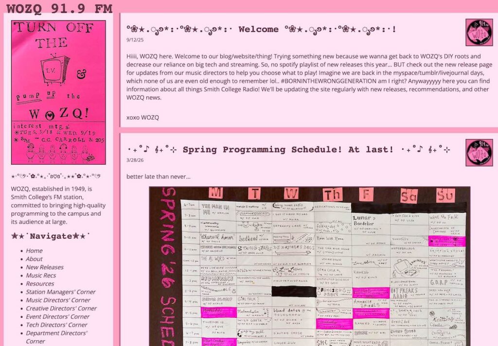 Past and present collide at WOZQ in countless ways. Old posters, flyers, and photos hang on the station’s walls and vintage equipment, ephemera and recordings are tucked away in hidden locations. The adorably retro WOZQ website resides on neocities. With a pink background and hand-drawn imagery (including the spring program schedule) the site feels like it was plucked from the DIY blog days of the late 1990s/early 2000s. A September 2025 announcement atop the site reads, “Welcome to our blog/website/thing! Trying something new because we wanna get back to WOZQ’s DIY roots and decrease our reliance on big tech and streaming…Imagine we are back in the myspace/tumblr/livejournal days, which none of us are even old enough to remember lol..”