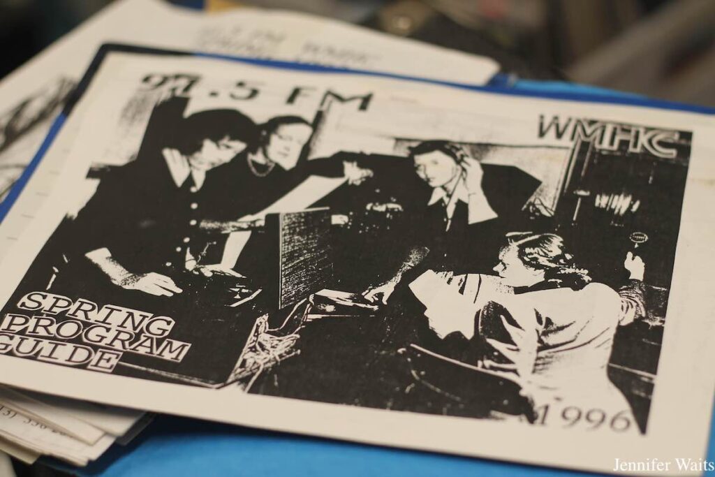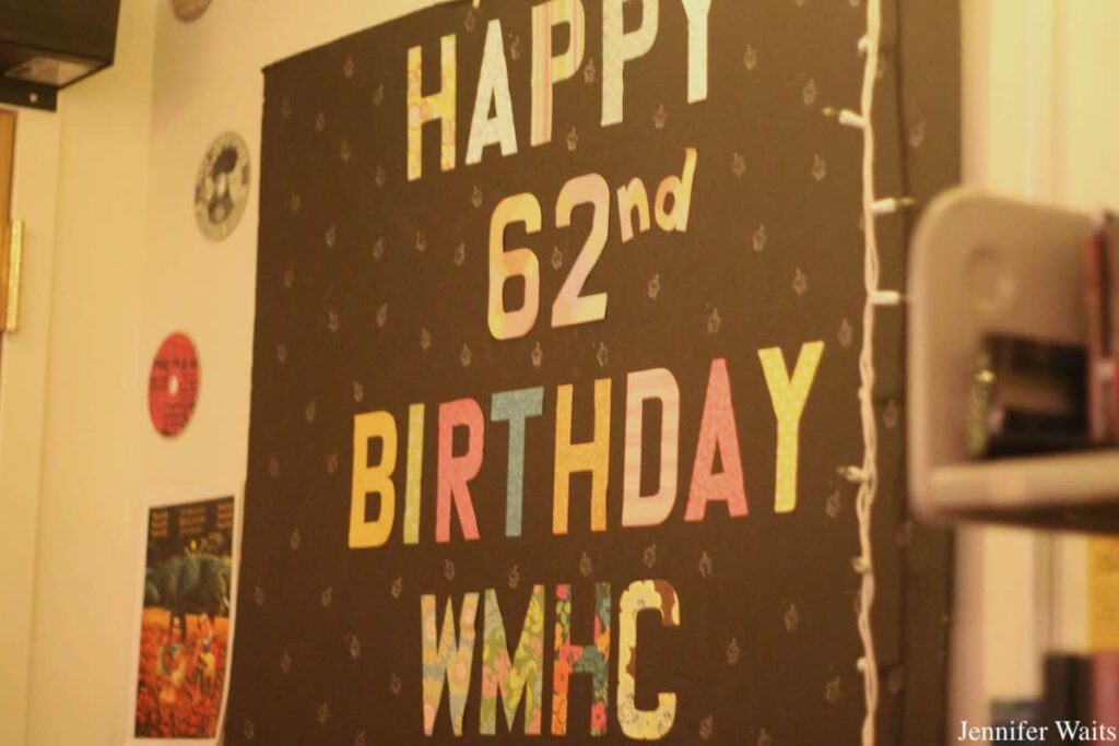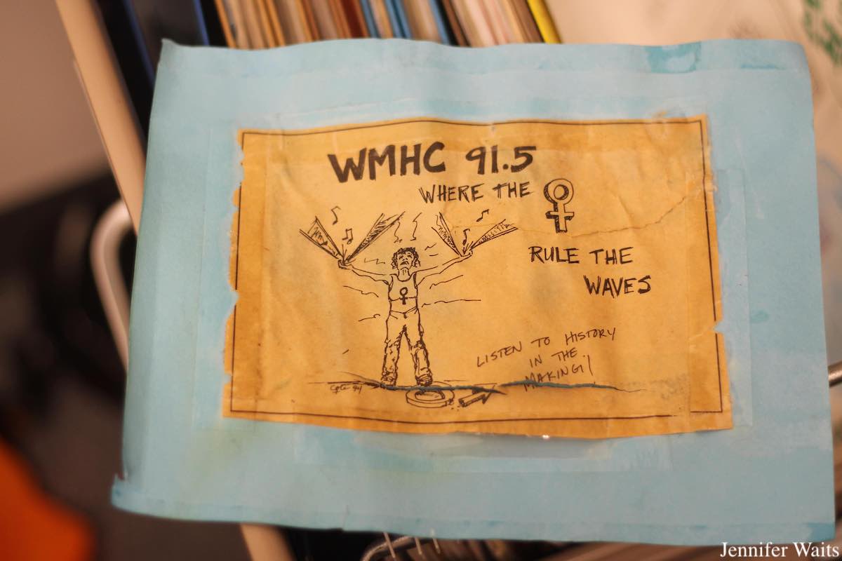 Nods to WMHC’s 75 year history are dotted on the walls throughout the station. An old Alumnae Memory Book includes the phrase “50 Years of Liberated Radio,” while a banner in the studio remains posted after the station’s 62nd birthday over a decade ago. A flyer for an unspecified WMHC Birthday touts a mid-life crisis theme, encouraging attendees to “dress like you’re going through hot flashes thinking about buying a new sports car.” Another flyer outlines some details from WMHC’s history, making the claim that “we are the oldest radio station in the country that has been continually operated by women.”