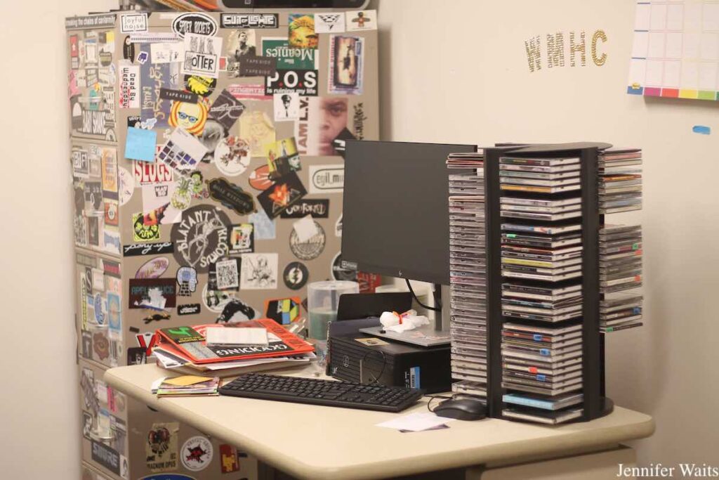Although WMHC has a lot of vinyl records and several turntables, that music is “going unused unfortunately” due in part to broken equipment and tight budgets, according to Rubio Lopez. Explaining that the station’s vinyl is “almost decorative at this point,” they said they wished they could get a new turntable, especially since it’s nostalgic for them to view photos of former DJs holding the very records housed in the station.