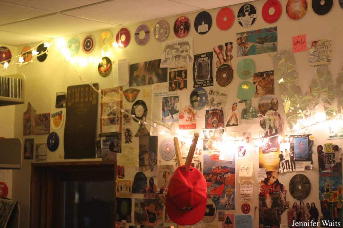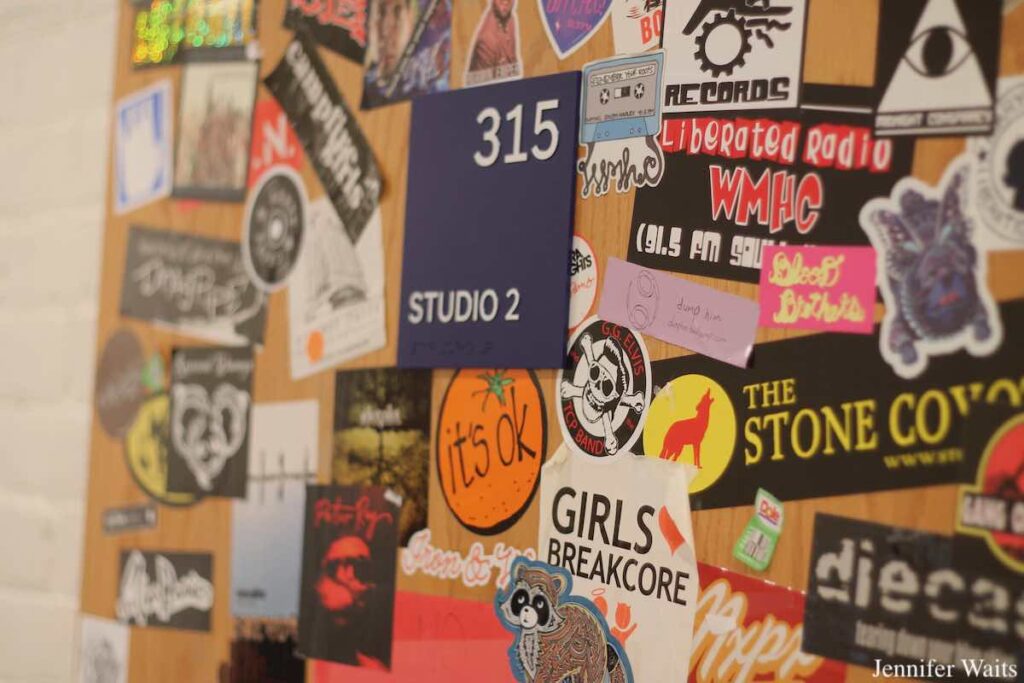 One of the first things we spotted was a sticker-covered door mounted on the wall near the entrance to WMHC. Plastered with band stickers (Hot Snakes, Primus, Brian Jonestown Massacre, Willie Nelson, The Thermals, Pixies and more) and radio station decals (I spied some for WMHC, WOZQ, WMUA, and WFUV), the door used to be the main entry point to WMHC. Rubio Lopez told me that upon returning to campus last fall, the station leaders discovered that the long-time door had been removed as part of an accessibility upgrade. Upset to see it gone, WMHCers managed to track it down and had it installed as decoration. Happy to see it back, Rubio Lopez pointed out that it’s “your first introduction to WMHC.”